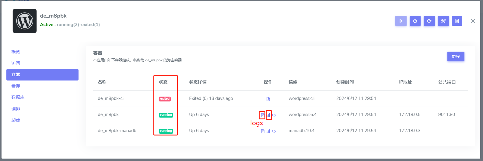 Websoft9 控制台提供对 WordPress 基本的监控,包括服务状态、资源占用等。