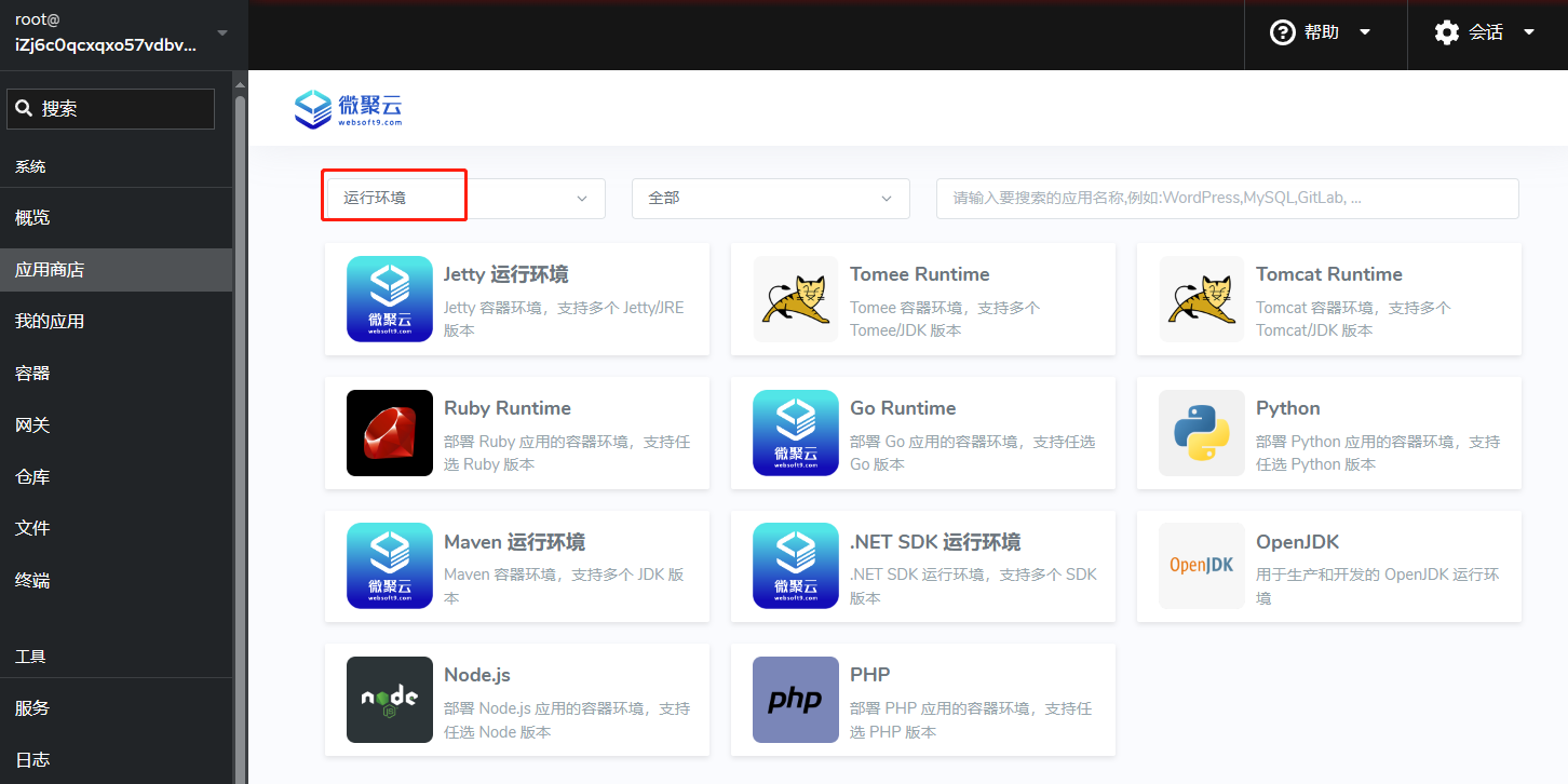 1. 登录 Websoft9 控制台,打开:"应用商店" 的 运行环境 类目