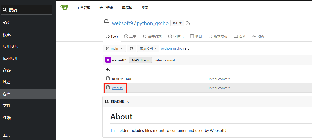 • 程序环境模板运行起来之后,Websoft9 为之创建三个部署核心资源:Git 仓库,容器,网关域名配置项