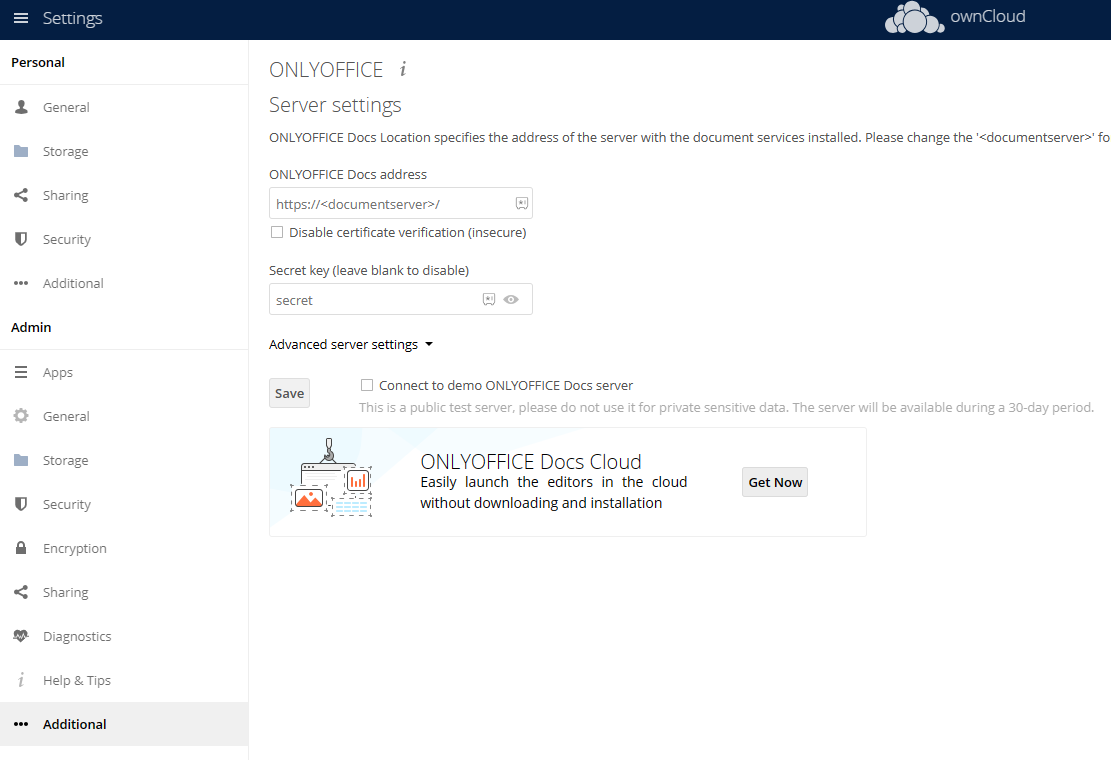 3. After installation, navigate to Settings > Admin > Additional to configure the ONLYOFFICE connection.
